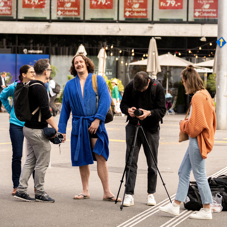 C'est par une agréable matinée de mai que nous nous réunissons à la gare de Berne. Un groupe diversifié de créatifs et d’aventuriers – l’équipe derrière ce projet un peu plus audacieux. Parmi eux, Cyril, notre courageux modèle amateur, prêt à plonger dans l'inconnu.