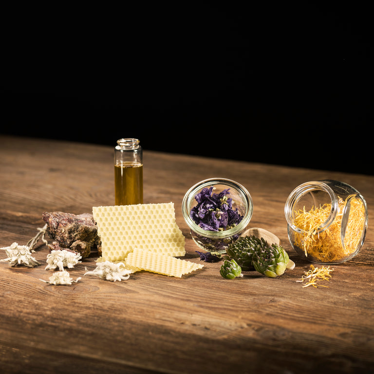 Regardez les ingrédients. Tout est 100% naturel. Sans additifs et sans compromis. Nous utilisons uniquement des matières premières naturelles et durables. Vous ne trouverez chez nous aucun conservateur, parfum ou colorant artificiel. Pas d'huile de palme, de microplastiques ou de paraffines. Nous utilisons autant d'ingrédients locaux que possible. Nous préférons utiliser de l’arum de montagne, de l’edelweiss et de la cire d’abeille à la place de l’aloe vera, du beurre de karité ou de l’huile de coco. Nous produisons nous-mêmes des essences alpines telles que l'arum des montagnes ou l'extrait d'edelweiss. À partir de plantes cultivées spécifiquement à cet effet. Nous collectons nous-mêmes la résine de sapin dans nos forêts.
