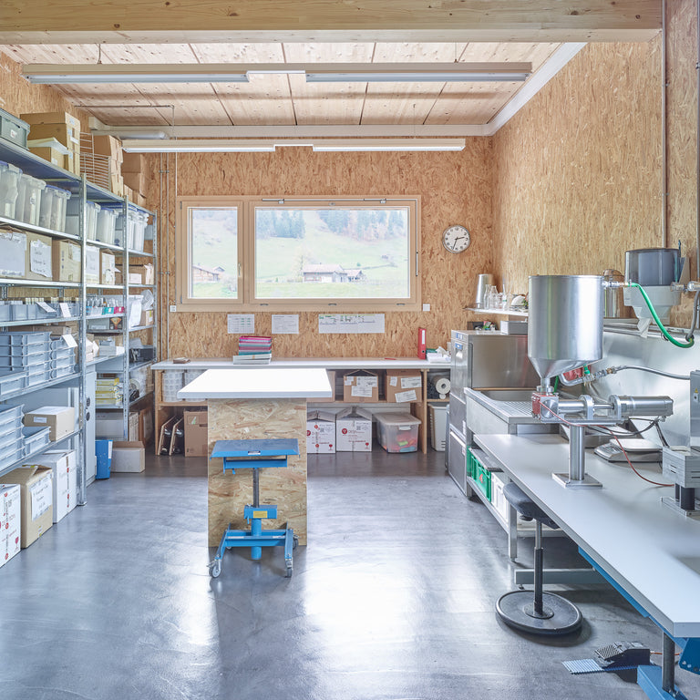 Aujourd'hui, nous sommes en mesure de développer et de produire nos produits naturels suisses dans une usine équipée de manière moderne. Dans notre propre bâtiment, avec l'énergie solaire de notre propre toit.